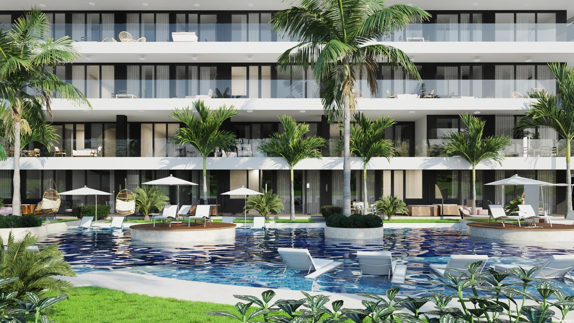 Apartamentos de 1 y 2 habitaciones con sus respectivos baños, estas unidades cuentan con terrazas o patios exclusivos, exquisito diseño y distribución, finísimas terminaciones en pisos y baños, piscina all-a-round, solarium, tumbonas, BBQ, área infantil, Gym, lobby, conserjería y las mejores vistas al maravilloso campo de Golf "Hard Rock Golf Course".
