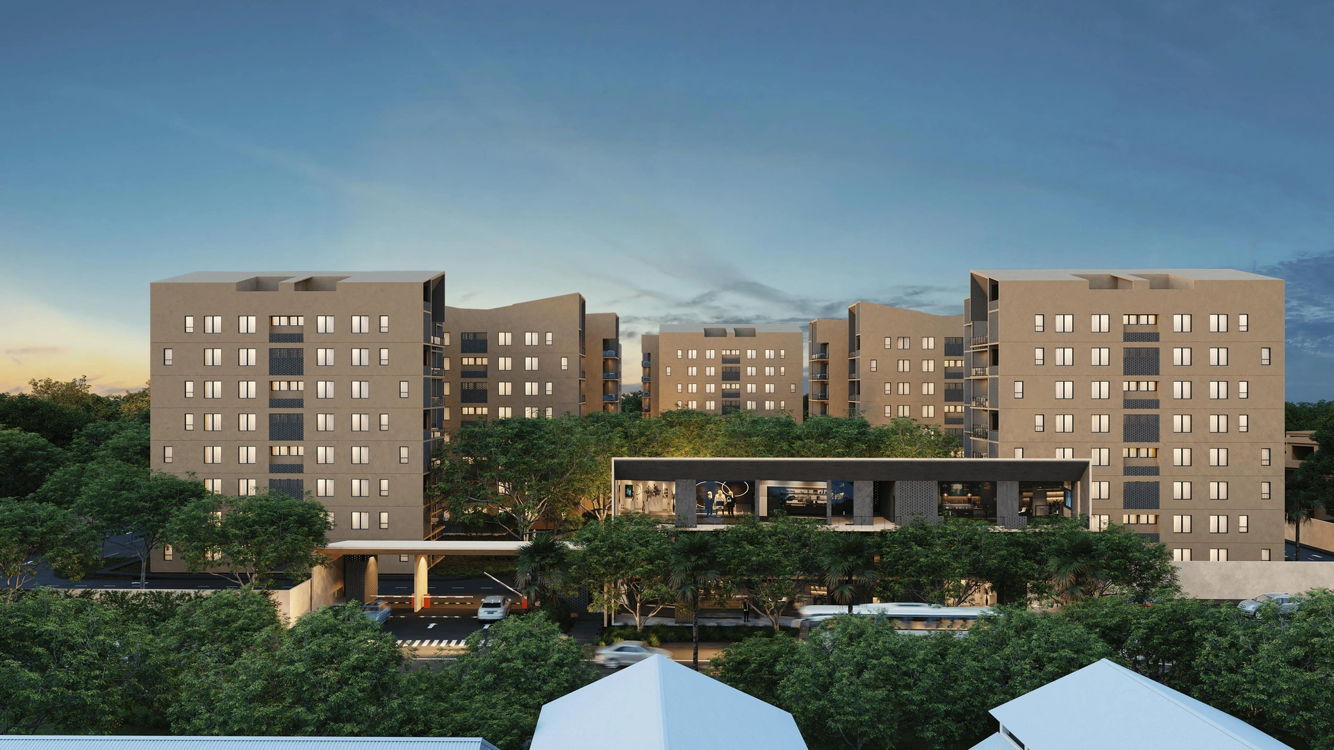 El proyecto cuenta con 256 parqueos para los apartamentos, 20 parqueos de la plaza comercial y 71 parqueos disponibles. Además, cuenta con una excelente plaza comercial de 17 locales en tres niveles, 2 baños comunes por nivel, ocupando así un área de 963 m2. Un área verde aproximadamente de 7,187.32 m2 además de un área común para eventos que tiene una piscina, gazebo de 100 m2 y desarrollamos un área de lockers de 224 m2