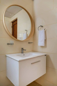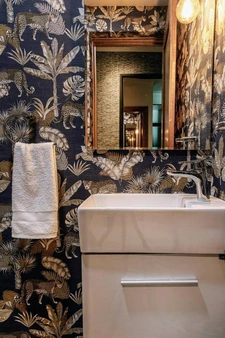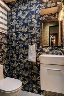 • 1.5 baños: Baño principal moderno con mampara de cristal y medio baño de visitas con papel tapiz de lujo.