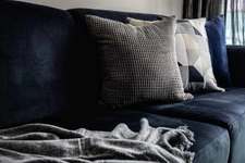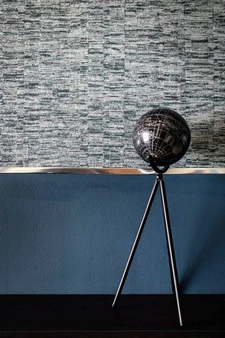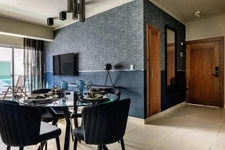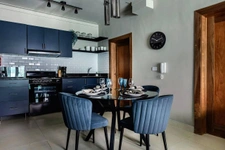 • Sala / Comedor con mobiliario de diseño contemporáneo y texturas decorativas en paredes.