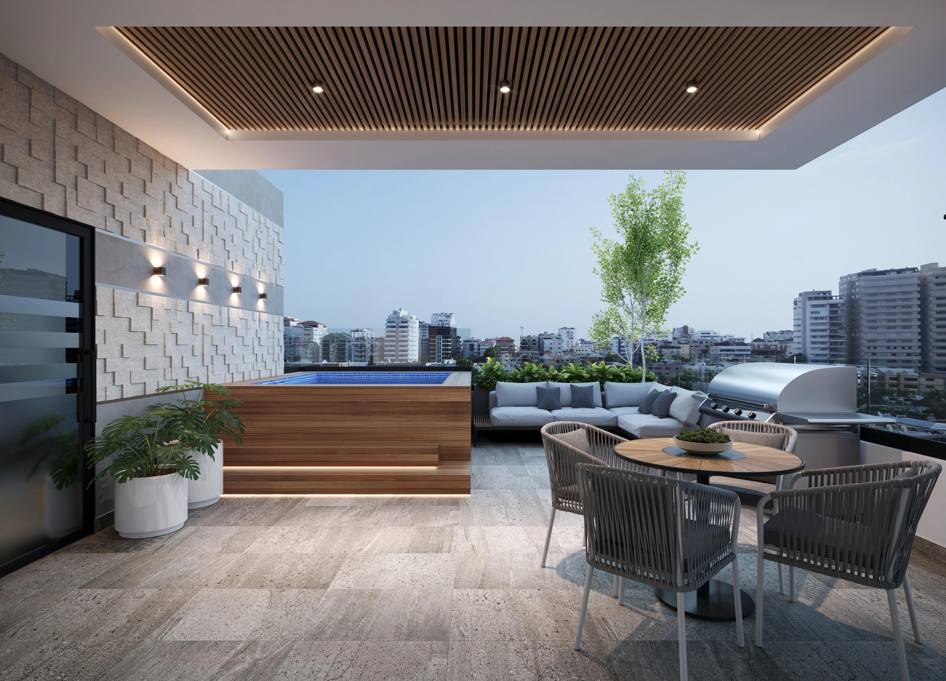 • Terraza destechada con jacuzzi y área de BBQ.