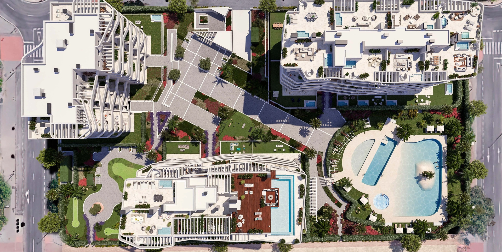 The residential complex offers a wide range of common areas designed for the enjoyment and well-being of its residents. A mini-golf course provides entertainment for all ages, while the landscaped areas offer a relaxing environment. The community gym is equipped for those who wish to maintain an active lifestyle without leaving home. The community pool is ideal for cooling off on hot days, and the jacuzzi offers an additional relaxation space. The little ones can enjoy the playground, designed for their fun and safety. Additionally, the complex features a community garage and parking, ensuring that all residents have access to a secure space for their vehicles.