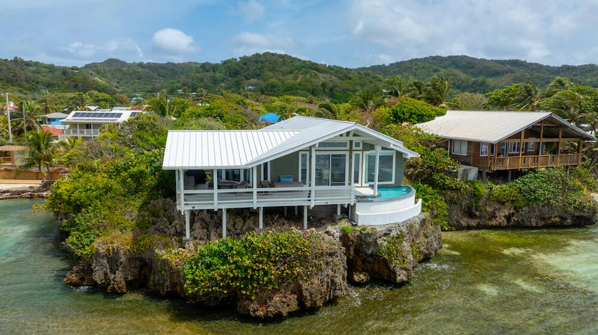 00164197675 - PensacoloaOcean Front Big Rock Property - Incredible beachfront property with stunning home located in Big Rock! Welcome to one of Roatan's hidden treasures as this very unique property is built over the black coral. This beautifully remodeled home offers 3 bedrooms & 3 bathrooms boasting 2453 sq-ft of living space sitting on .564 of an acre of prime beachfront and coral-front land. This is an unparalleled blend of natural beauty, comfort and opportunity for those wanting to expand. This home was rebuilt in 2018 from the ground up and offers a solid well engineered structure designed for island living. The foundation features PVC protected concrete pillars, wood framing with DuraRock and concrete surface treatment, 11 inch thick exterior walls for durability, and walls are insulated.
