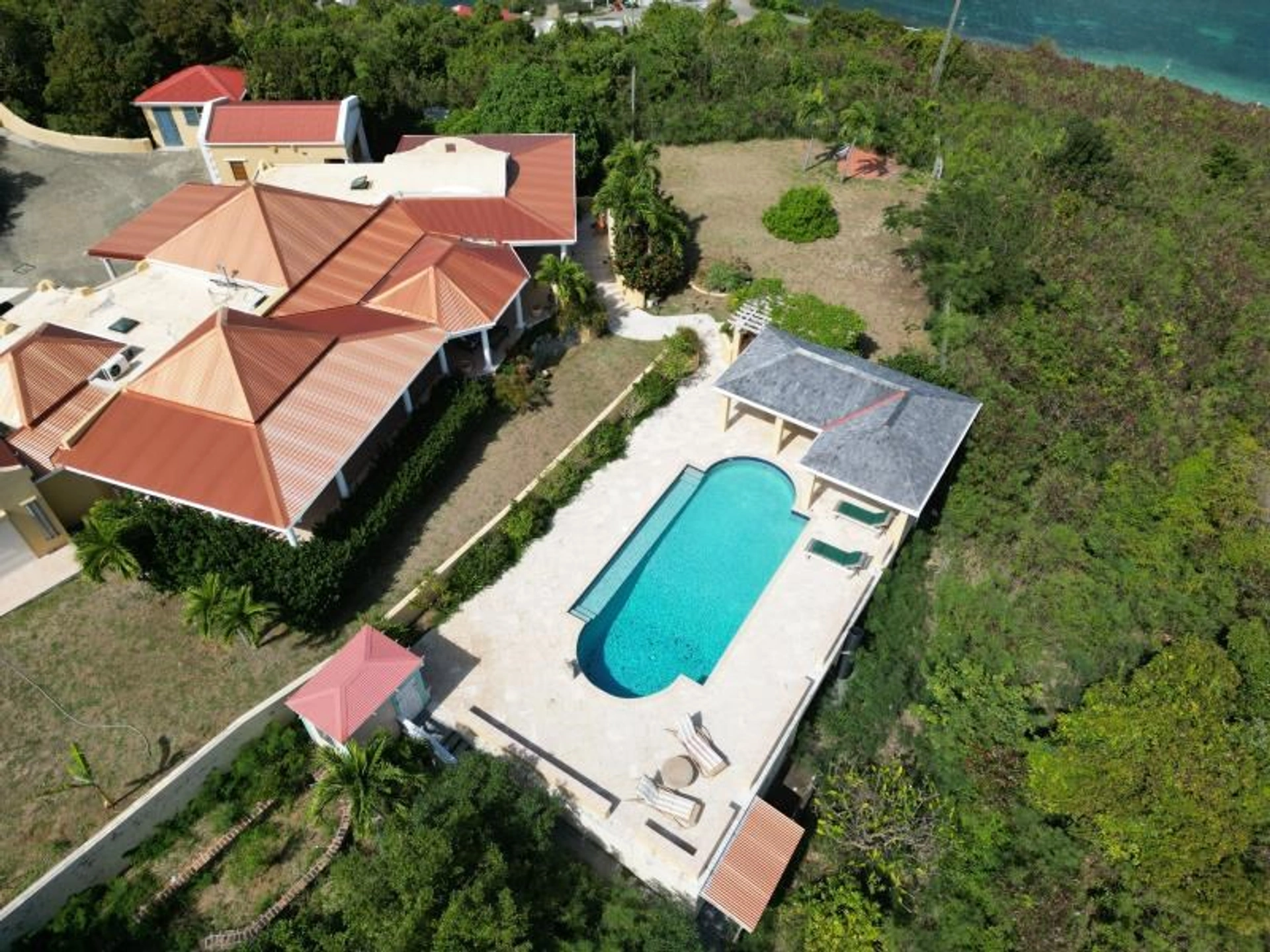 20001248182 - Vista Aerea on Frenchman's Cay - High Above on the well sought after Islet known as Frenchman's Cay is where you will find this 4 bedroom 3.5 bathroom Villa that offers some of the BVI's most enchanting views. Frenchman's Cay is connected to Tortola via abridge thats always accessible. Its only about 50ft apart from Tortola . However this seperation that is similar to beef island has granted Frenchman's cay some of the most valuable real estate in the BVI. It is often considered to be part of Tortola. Vista Aerea is one of 3 homes located at the top of Frenchman's Cay. It offers amazing views of the drakes channel, the eastern islands of the BVI and St John. The property sits on 0.79 acres of very gentle sloping land . Land with this slope is very rare in the BVI as 90% of villas sit on a much steeper incline. Vista Aerea offers generous amounts of out door space ,with over 3000 sq ft of covered and uncovered concreted terrace space . The pool area offers great space for entertaining, bbq, birthday parties, date nights and more. It really is an amazing location and woud automically put you in the top 10 percentile of special views in the BVI. The property was built about 24 years ago and no cosmetic updates have taken place. However there is new galvalume on the roof of the property as seen in the photos. The main bedroom and the separated guest bedroom are the largest rooms on the property . The main bedroom offers a large walk in bathroom that offers a white canvas perfect for reimagining. The interior space of this British Virgin Islands Villa on Frenchman's Cay is just over 2700 sqft . The property was well built and the land offers potential to add geust cottages or more developed outside play/entertaining areas.
