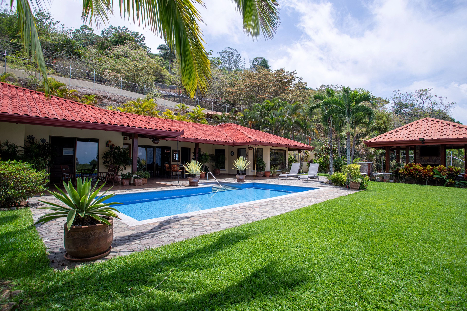 400051521038 - Beautiful home and guest home in mint condition in Vista Atenas - Beautiful home and guest home in mint condition in Vista Atenas, town's oldest expat neighborhood, which located in the cooler climates above downtown Atenas with a comfortable altitude of 965 meters (3166 feet) and features amazing views of the area mountains. The property features two entrances, the independent entry below is ideal for a guest home, an added orchard or any desired project. The home's topentrance has a long private entrance with a side enclosed garage with automatic garage door. Entering the home's courtyard leads to an ample and well taken care of gardens with lush landscapping throughout the property.The main home's formal entry leads to one wing with the master bedroom suite. The open floor concept leads to the living and dining room areas and the ample kitchen. There is lovelyartesenal woodworkin the kitchen and bathroom cabinetry with slat wooden ceilings and wooden doors and closets throughout. On the other wing are two bedrooms and a guest bathroom. There is also an additional tv room.Outside large covered wrap around porches make their way around the home, ideal for outdoor living or entertaining a large crowd. The large deck and swimming pool area is located directly across from the front porch area. Farther into the property is the independent and attached guest apartment with kithchenette and plenty of room for guests. There is a common bbq area between both wings of the property.Outside there is a separatesitting area with a tv and functional chimney. Adjacent is an inviting deck with jacuzzi.The home is sold fully furnished and turnkey. Fiber optic is also available. Added amenities include 2 large 5000 & 1500 liter back up water tanks. There is a sprinkler system through the property. There is also a large laundry and storage area between the main home and the apartment. There is gas heating, 4 storage areas and an added security and camera system.You can now use My Second Street for mortgages in Costa Rica for American citizens and residents. Fast, east home financing for Costa Rica real estate. Get 30-year fixed-rate mortgages.Pre-Qualify now: https://www.mysecondstreet.com/prequalify