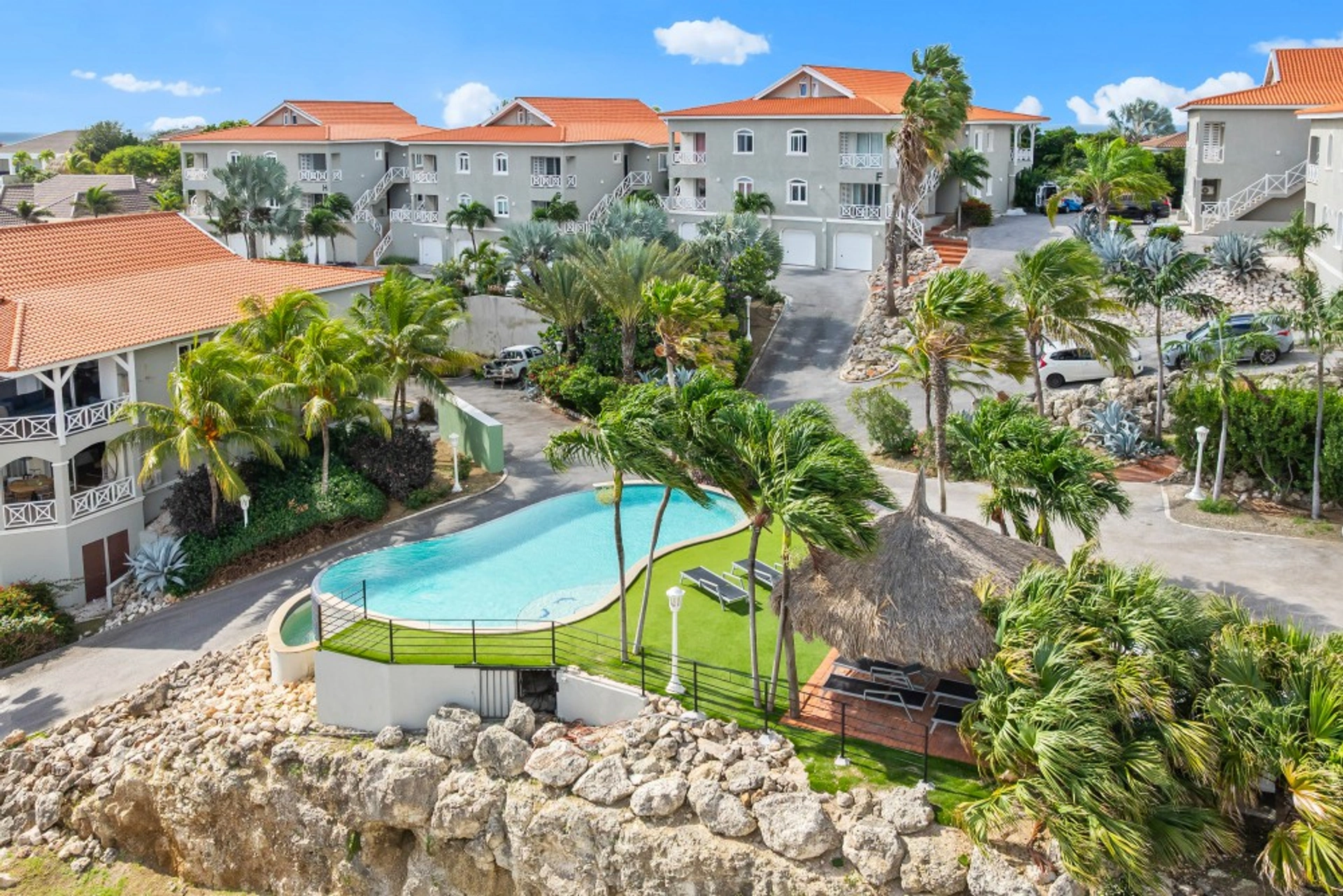 000872160129 - Blue Bay – Spacious Apartment with Sea View in Residence Le Bleu - At Residence Le Bleu, this charming and spacious apartment is offered for sale. Please note: vacation rentals are not allowed here, as Residence Le Bleu is located in a residential area. Permanent residence and long-term rentals are permitted.Located on the ground floor, the apartment offers 160 m² of living space. Because Le Bleu is conveniently built on a hill, its elevated position provides beautiful views over a part of the sea and the island. In addition, the apartment offers plenty of privacy and benefits from excellent natural ventilation.Through a spacious entrance, you enter the large and bright living room. At the rear of the living room, you will find a newly renovated luxury semi-open kitchen equipped with a refrigerator, combination microwave/oven, and dishwasher. The kitchen island features an induction cooktop.From the living room, a glass folding sliding door leads to a large covered terrace, offering stunning views over the resort and the island. By fully opening the sliding doors, the living room and porch become one large living space.This luxurious home features a complete master suite with a spacious bedroom and en-suite bathroom. From this bedroom, you have access to the porch through a sliding door. The two guest bedrooms share the second common bathroom.There is a separate storage closet in the hallway with sufficient space for a washing machine and dryer. All rooms are pre-wired for television, telephone, and internet. There are ample 220-volt electrical outlets available. All windows and doors, made of durable and low-maintenance synthetic materials, are manufactured in Germany and feature convenient tilt-and-turn functionality. All rooms are equipped with air conditioning, which, together with the wall insulation, can result in up to 30% savings on electricity consumption for cooling.Residents of Residence Le Bleu can use the communal swimming pool with palapa and artificial grass and also receive a Blue Bay beach pass granting access to the beach club. Additionally, each apartment comes with two parking spaces.Residence Le Bleu consists of a total of 32 apartments in eight classic Caribbean-style buildings. Each building contains 2 ground-floor apartments and 2 penthouses.Residence Le Bleu is located at the top of a hill in Blue Bay Heights, the most exclusive section of Blue Bay Golf & Beach Resort. The apartments and penthouses are surrounded by beautifully landscaped gardens with mature palm trees. There is a lovely communal swimming pool and ample parking space. Due to the elevated location, optimal use is made of the cooling trade winds.To ensure a peaceful and pleasant living environment, tourist rentals are excluded in this section of Blue Bay. Properties in the residential areas are intended for private residence or long-term rental.Residence Le Bleu has an excellent safety track record, with security well managed by Blue Bay Golf & Beach Resort.From Residence Le Bleu, all amenities are within easy reach. The resort itself features a beautiful beach with crystal-clear blue water, a swimming pool with a children’s pool, the restaurant Azzurro, a bikini shop, dive shop, massage pavilion, tennis courts, and a fitness center.In the nearby area, you will find a large supermarket, pharmacy, general practitioner, gas station, and various schools (from kindergarten to university).The center of Willemstad, with its many attractions, is only a 10-minute drive away. If you wish to explore the untouched western side of Curaçao, Residence Le Bleu is also an ideal base.The apartment is currently rented on a long-term basis.Are you interested in this beautiful apartment? Contact Rick Seisveld today!