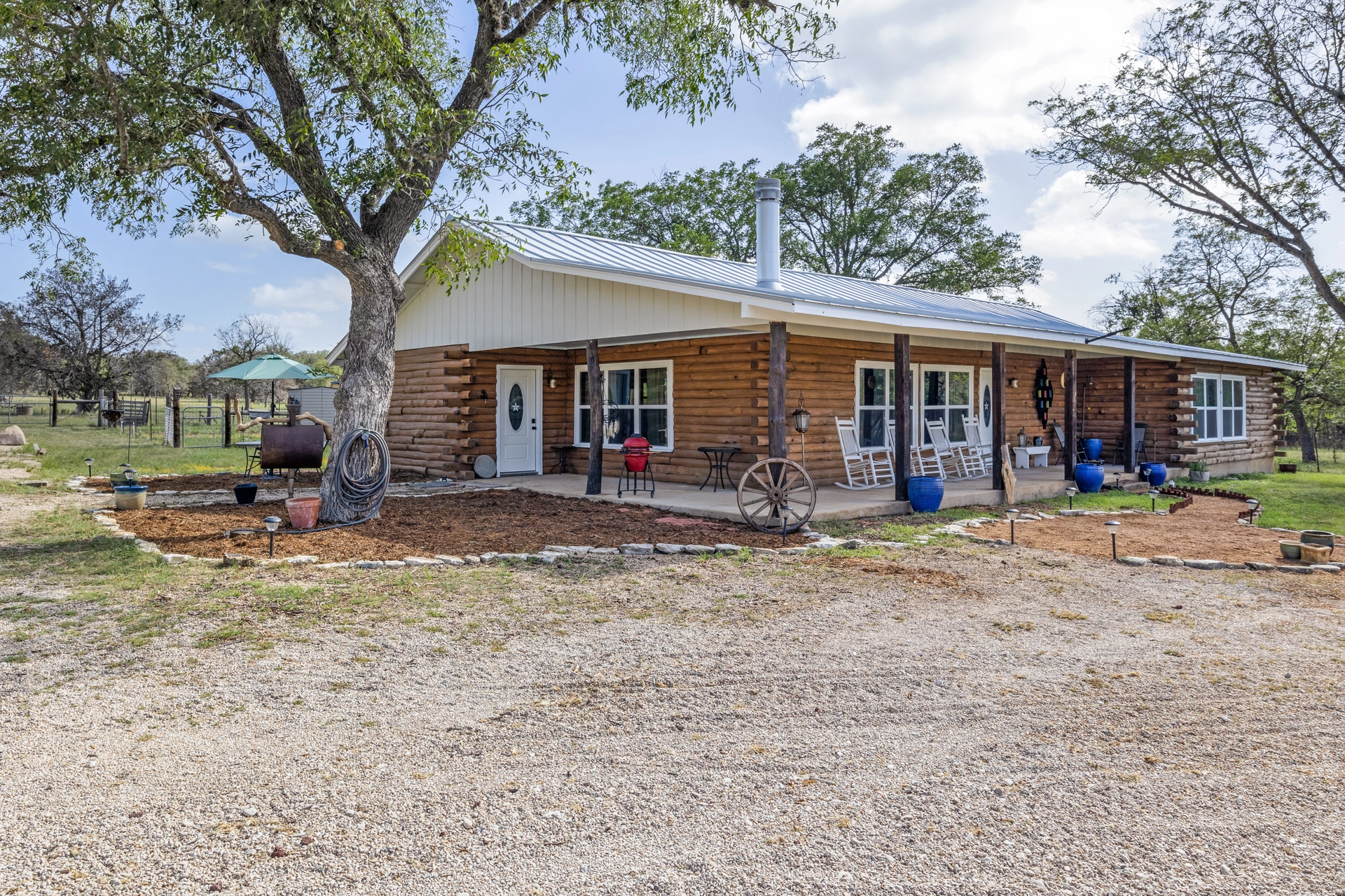This is your opportunity to own a piece of Texas and live in a lovely authentic log cabin! Most of this home has been nicely updated (within the past 3 years). Kitchen has custom alder wood cabinets, granite counter tops, farmhouse sink, custom island on wheels, propane gas range from Italy, custom light fixtures over island, new tile thoughout the home, interior and exterior paint, both bathrooms have been nicely updated. This property is just under 15 acres, has new roof, new windows, new exterior doors, It also has a well house, septic system, new filtration and water softener system, 30X40X16 metal building w/extension to conex (shipping container) for. covered parking, building has dusk to dawn exterior lighting, 2 rollup & 2 walk-in doors, building also has insulation and LED lighting and plenty of outlets.