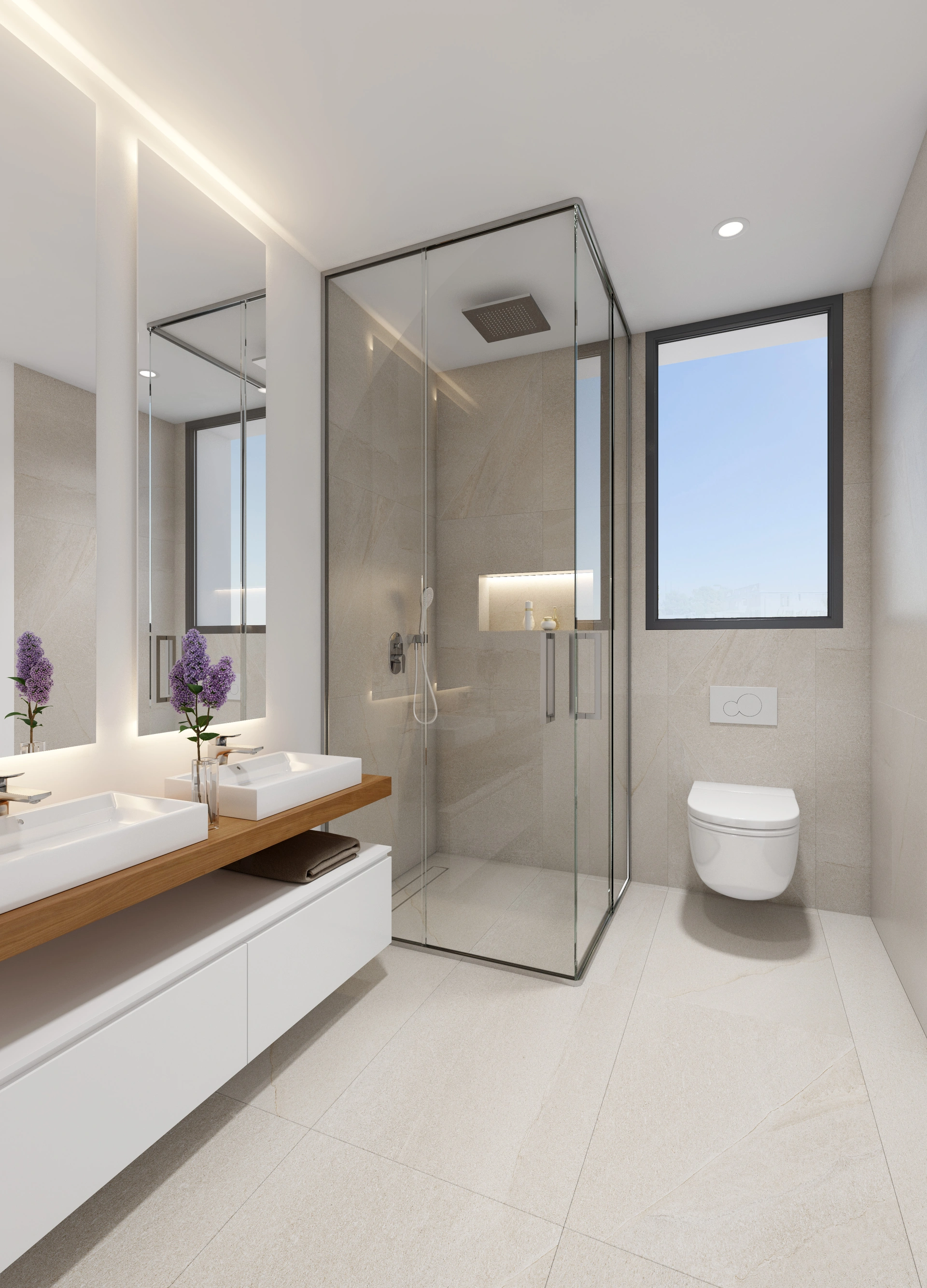 The interiors of these homes in Finestrat are carefully designed to offer maximum comfort and functionality. Layout options include properties with 3 or 4 bedrooms and 3 or 4 bathrooms, adapting to the needs of each family. Ceramic floors provide a modern touch and are easy to maintain. The homes are equipped with air conditioning and smart home technology, allowing for efficient home control. Electric shutters and high-quality appliances complete a set of features that ensure a comfortable and modern living experience. Built-in wardrobes offer additional storage space, maintaining the home's order and aesthetics.
