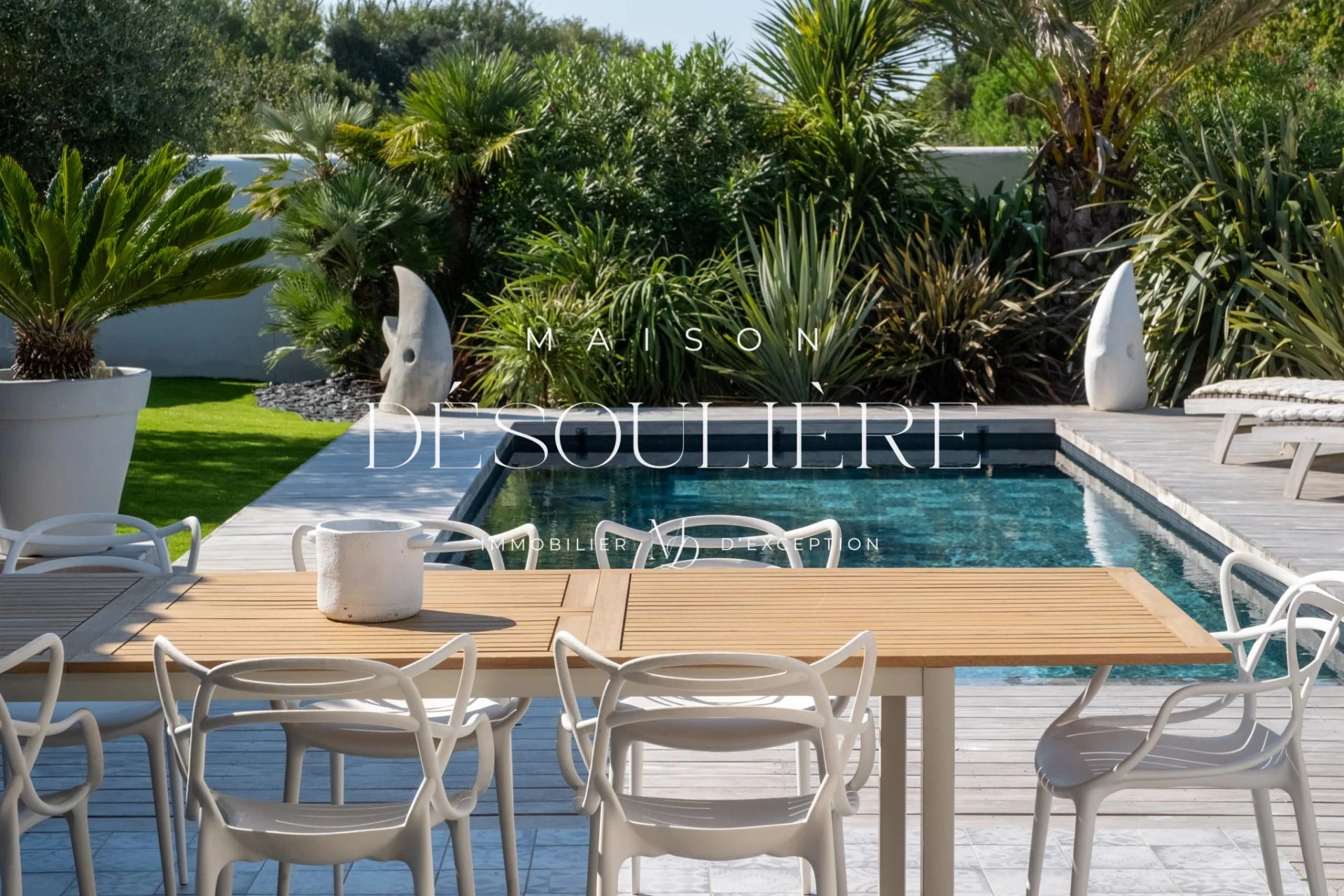 À l'extérieur, profitez d'une splendide terrasse, d'un espace préau, d'un jardin avec son salon et ses bains de soleil, d'une piscine chauffée, et de sa douche extérieur.