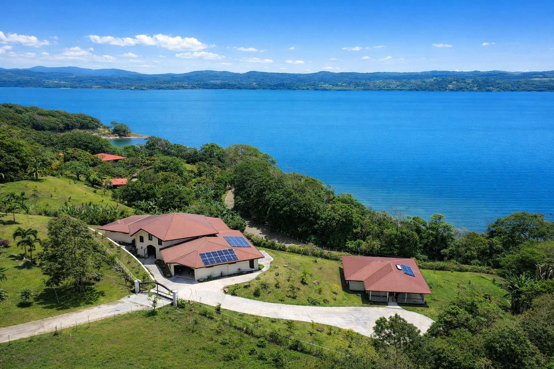 400193913062 - Villa Brisa: Distinguished Guanacaste Estate with Panoramic Views of the Iconic Arenal Volcano & Lake Arenal - Set on nearly an acre of beautifully landscaped grounds, Villa Brisa is a 7,100 sq ft three-bedroom, four-bathroom custom residence that defines elevated living in the Lake Arenal region. Positioned as the final home on a private road within an exclusive gated community, the property offers unmatched privacy, exceptional security, and breathtaking panoramic views of both Lake Arenal and the Arenal Volcano. The estate includes the main residence, along with a private guest casita designed as a refined, scaled version of the primary home.Main ResidenceThoughtfully designed in a circular layout to capture dramatic views from every angle, the main residence showcases exceptional craftsmanship, imported fixtures, and a seamless indoor–outdoor lifestyle. A covered front terrace introduces the home’s warm, organic aesthetic and places nature at the center of everyday living.At the heart of the home is a grand great room accented by solid Guanacaste wood doors, cabinetry, baseboards, and trim. The chef’s kitchen features premium imported ZLINE and Bosch appliances, a generous island, quartzite countertops, and a walk-in butler’s pantry complete with deep freezer, additional sink, and custom wood cabinetry. Imported copper sinks add character and artisanal detail throughout both the primary home and the casita.Floor-to-ceiling European tilt-and-turn windows wrap the residence, immersing each room in natural light and framing uninterrupted views of the lake and volcano. The formal dining area includes a built-in butler’s pantry with wine fridge and custom woodwork that enhances the home’s cohesive, elegant design.The principal suite is a private retreat offering sweeping views of Lake Arenal directly from the king-sized bed. It includes a spacious walk-in closet and dressing area, along with a spa-inspired ensuite featuring dual vanities, a water closet, and dual rain showers. A versatile guest bedroom or home office occupies the opposite wing and includes custom cabinetry and a Murphy bed, allowing for flexible use of space. Nearby, a dedicated home theater wired for 7.1 audio delivers a premium cinematic experience. The large four-car garage offers abundant room for vehicles, watercraft, and recreational equipment, and whole-house audio extends throughout the home, including the garage.Smart Home & SustainabilityVilla Brisa incorporates a fully integrated smart-home system and is capable of operating entirely off-grid. The estate is powered by an advanced solar panel array with a complete battery system, while still maintaining connection to the public grid for backup. Both the main residence and the guest casita are ADA-compliant, ensuring accessibility throughout. Additional features include a whole-house water filtration and softening system, comprehensive surge protection, and a full interior and exterior security system.Guest CasitaThe private casita is a thoughtfully executed extension of the main residence, echoing the same level of quality and design. It features a full imported ZLINE kitchen, a comfortable living area, one bedroom and one bathroom, an office, and its own laundry room. The casita operates on an independent solar and battery system and enjoys the same captivating views of Lake Arenal and the Arenal Volcano.A Sanctuary of Luxury, Privacy & SustainabilityVilla Brisa is more than a home, it is a sanctuary where modern luxury, intelligent design, and Costa Rica’s natural beauty converge. Offering unparalleled privacy, architectural excellence, and the rare ability to live completely off-grid without compromise, Villa Brisa stands as one of Guanacaste’s most distinguished estates.