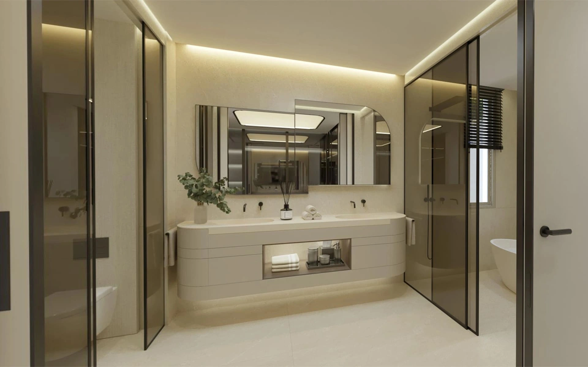 The interiors of the homes are designed for maximum comfort and luxury. With built areas of up to 416 m², the homes feature spacious, light-filled living rooms that extend out onto 141 m² terraces, offering a seamless flow between indoors and outdoors. The kitchens, fully equipped with top-of-the-range appliances, are designed to be functional and elegant. The bedrooms, all doubles with en-suite bathrooms, are arranged to ensure privacy and comfort. The high quality finishes and modern, minimalist design are reflected in every detail, creating a sophisticated and welcoming atmosphere.